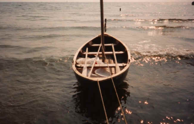 Meginjolle fortøjet til pæl ud for stranden i Espergærde